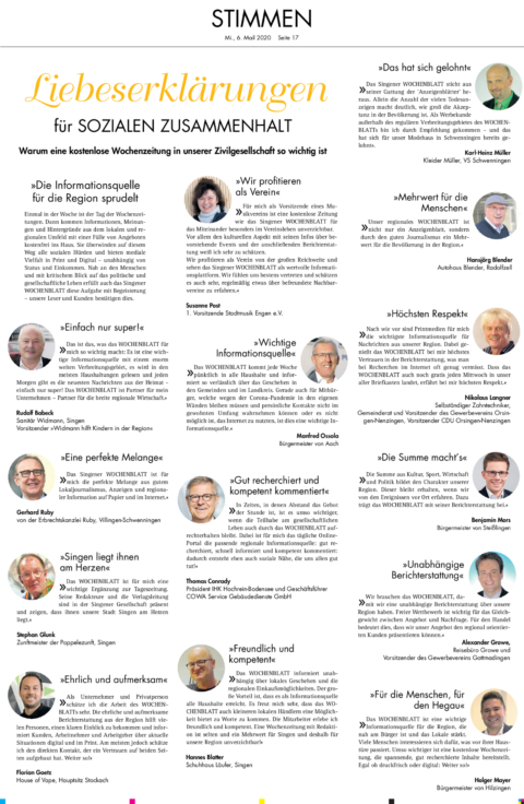 Informationen aus dem direkten Lebensumfeld der Menschen waren noch nie so wichtig wie heute. Was wird in der Straße nebenan gebaut? Wann ist die Bücherei offen und welche Sportarten bieten die Vereine vor Ort? Hat der Gemeinderat die neue Haltestelle auf die Agenda genommen? All diese Informationen werden dringend benötigt und von den Wochenblättern regelmäßig und kostenlos direkt in den Briefkasten geliefert. Die Mediengattung gilt deshalb als systemrelevant.