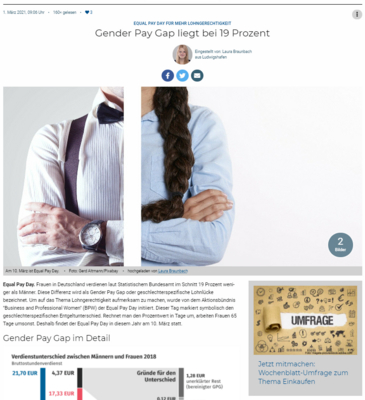 Faire Bezahlung für Männer und Frauen geht uns alle an. Deswegen berichteten die Wochenblätter zum “Equal Pay Day” am 10. März umfassend über das Thema. In Millionenauflage und natürlich immer mit lokalem Bezug.